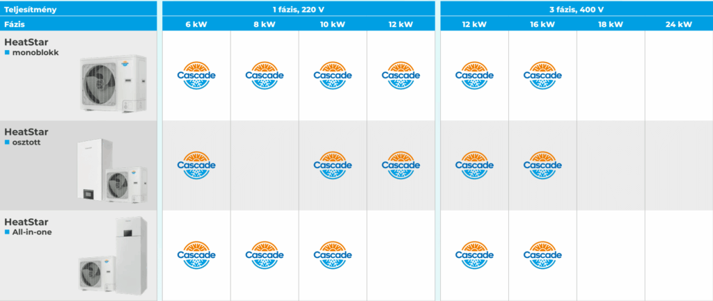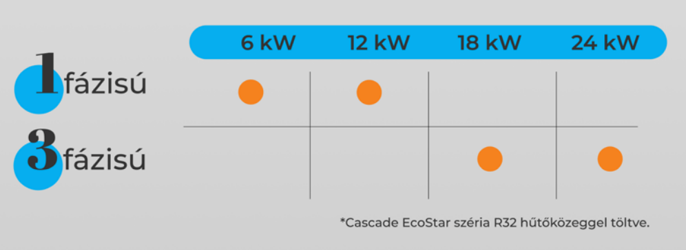 A kínálat rendkívül széles, a kisebb otthonokat kiszolgáló 6 kW-os berendezéstől a komolyabb igényeket kielégítő 18 kW-os készülékig terjed. Ha ennél is nagyobb teljesítményre van szükség, akkor a 24 kW teljesítményű, R32 hűtőközeggel töltött Cascade EcoStar hőszivattyú ideális választás.